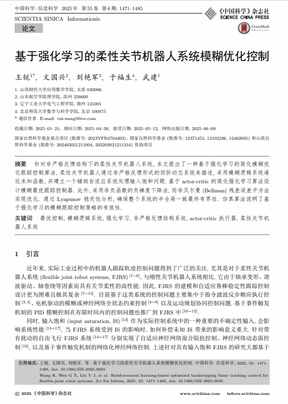 与此同时,青年教师王锐博士在智能系统控制领域的研究也取得重要成果。其论文《基于强化学习的柔性关节机器人系统的模糊优化控制》在《中国科学:信息科学》2025年第6期正式发表。面对柔性关节机器人系统建模复杂、控制难度大的挑战,王锐博士提出了一种基于强化学习的简化模糊优化跟踪控制算法。该研究利用模糊逻辑系统逼近未知函数,结合Actor-Critic强化学习框架,设计出具有优化性能的跟踪控制器,并通过Lyapunov理论证明了系统的半全局一致有界稳定性。该成果为处理机器人系统中的输入饱和与不确定性控制问题提供了新思路,对推动智能机器人技术发展具有重要参考价值。