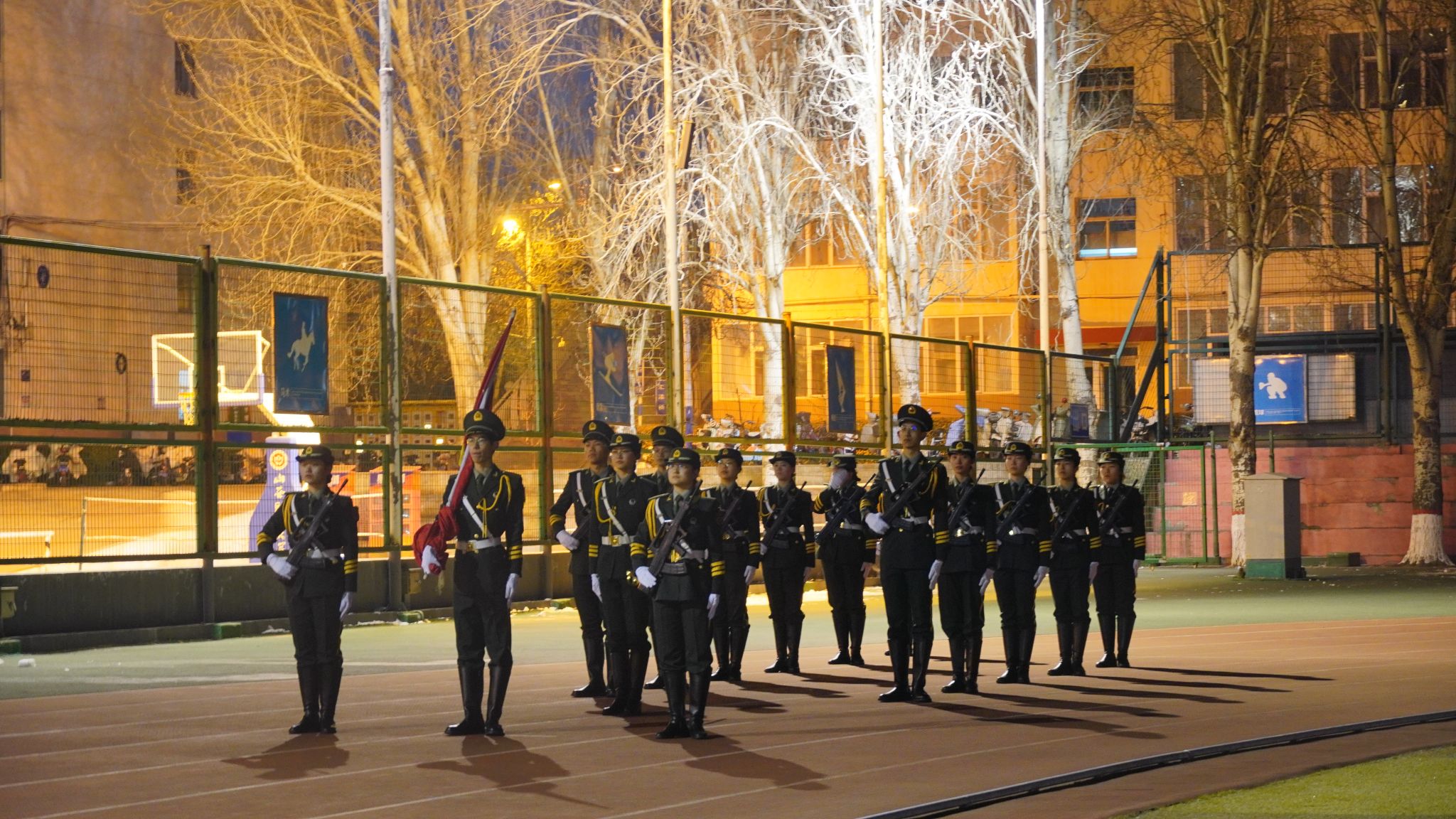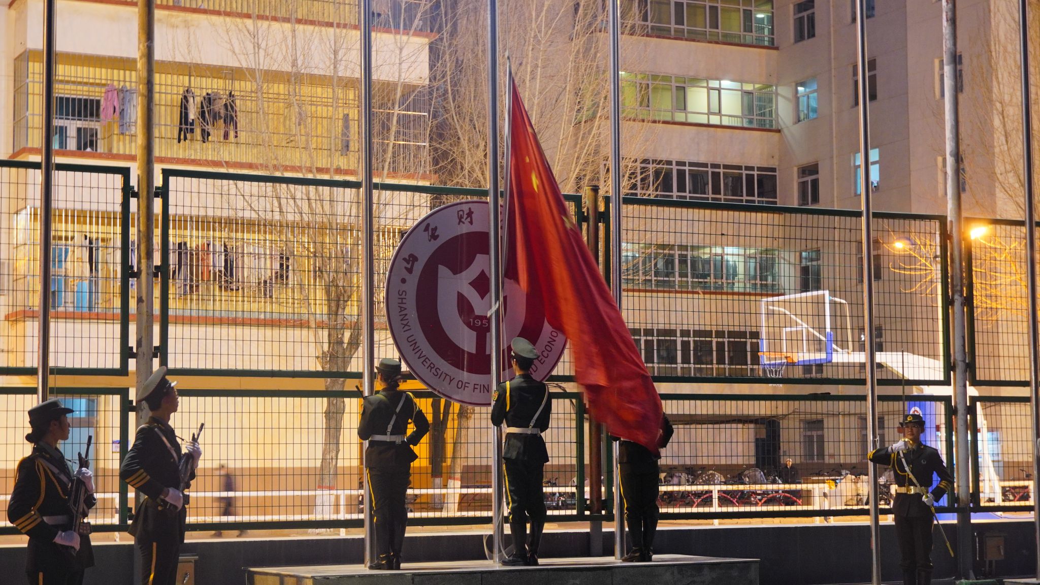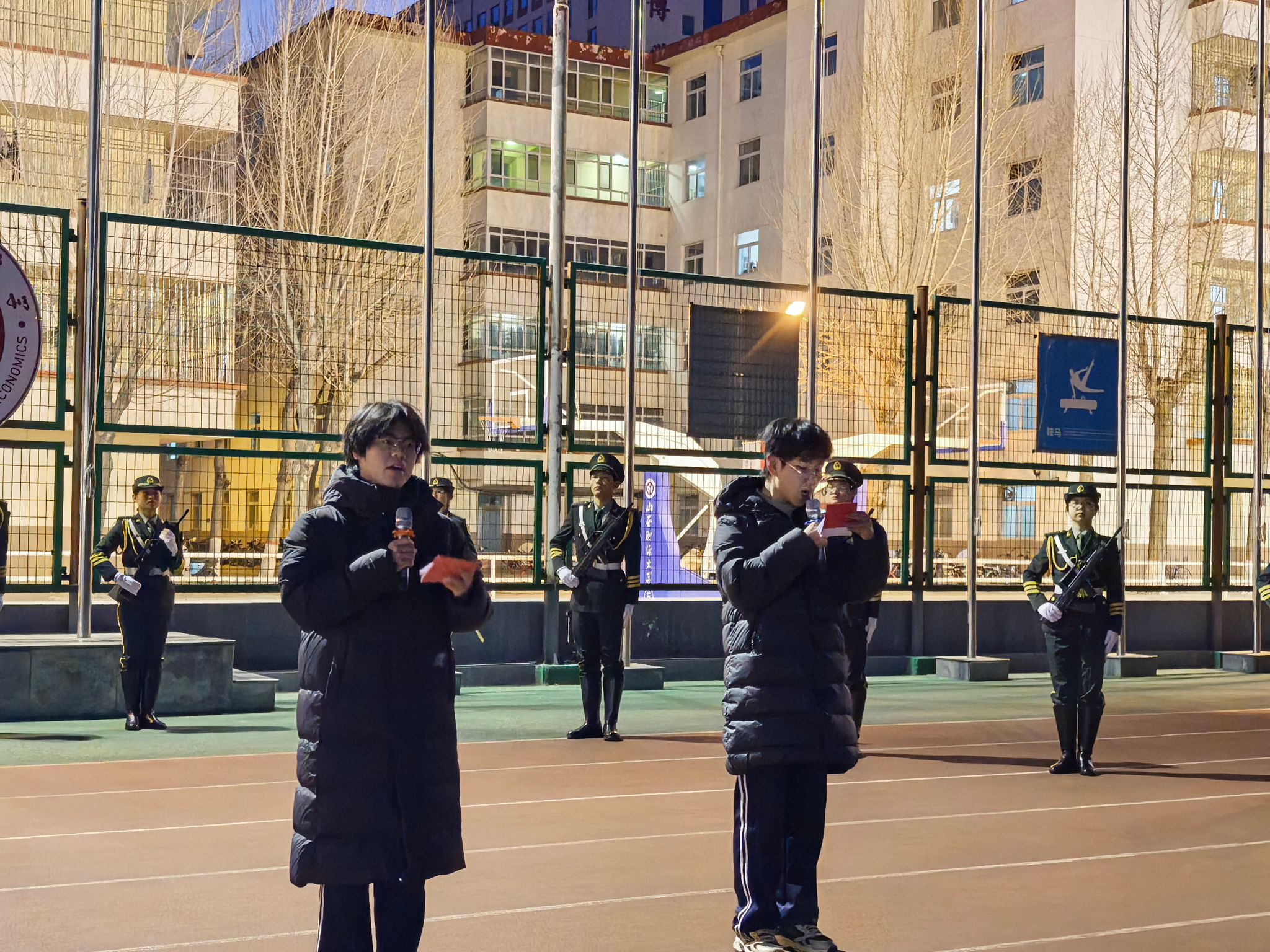 晨曦微露,夜色未退,操场灯光与校徽交相辉映。伴随着激昂的国歌声,护旗队迈着铿锵有力的步伐入场,身姿挺拔、步履坚定,充分展现出青年学子昂扬向上的精神风貌。在庄严的注目礼中,鲜艳的五星红旗在晨风中冉冉升起,在场师生肃立致敬、齐唱国歌,心中涌动着对祖国的无限热爱与崇高敬意。