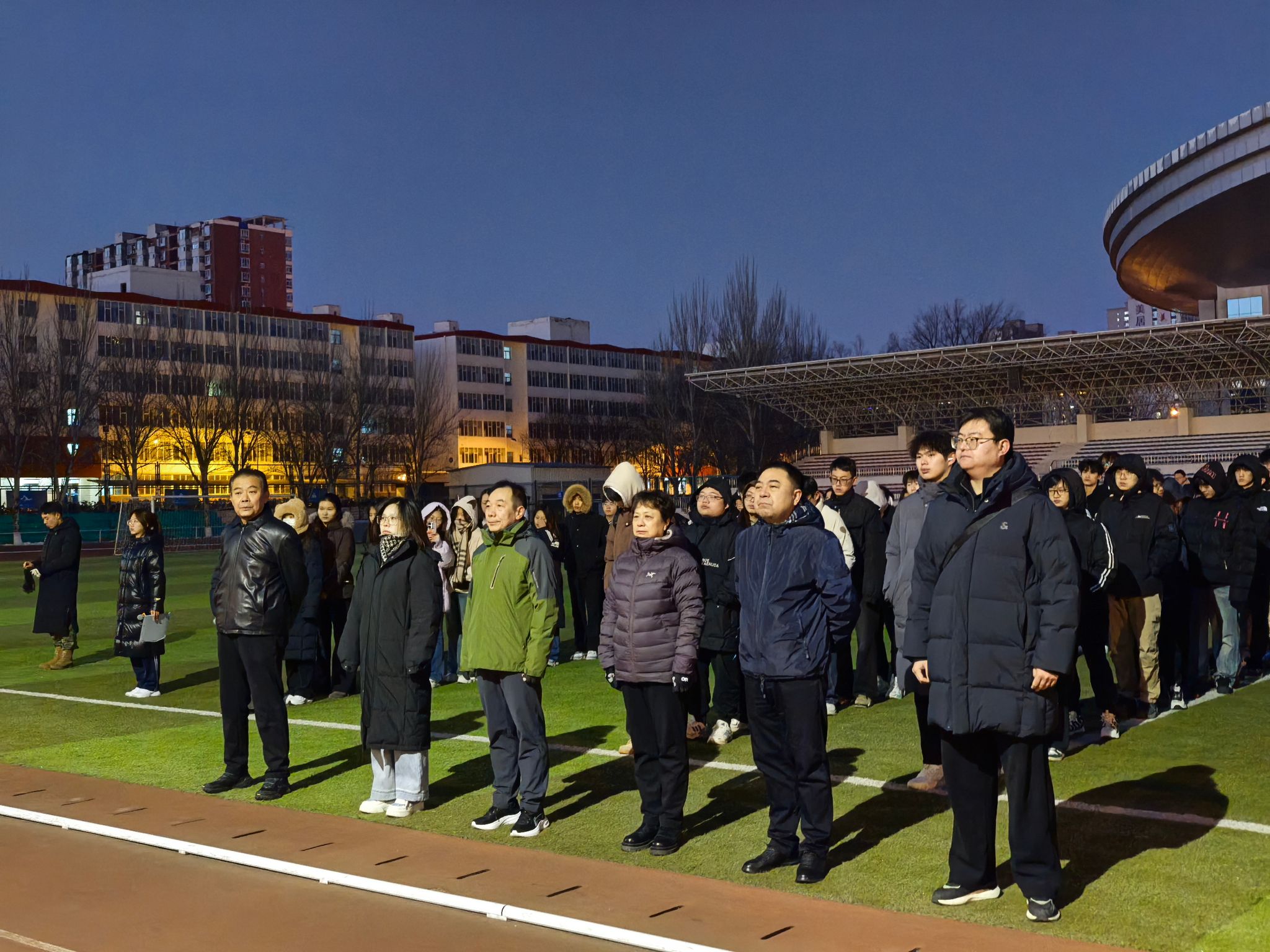 晨曦微露,夜色未退,操场灯光与校徽交相辉映。伴随着激昂的国歌声,护旗队迈着铿锵有力的步伐入场,身姿挺拔、步履坚定,充分展现出青年学子昂扬向上的精神风貌。在庄严的注目礼中,鲜艳的五星红旗在晨风中冉冉升起,在场师生肃立致敬、齐唱国歌,心中涌动着对祖国的无限热爱与崇高敬意。